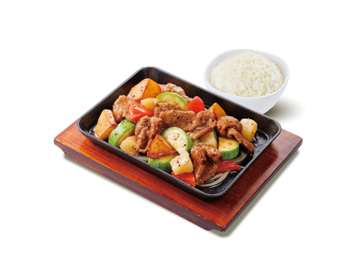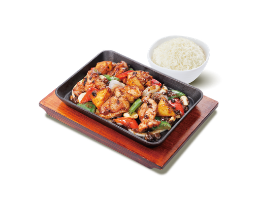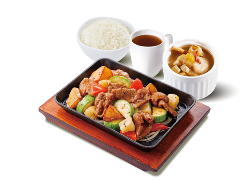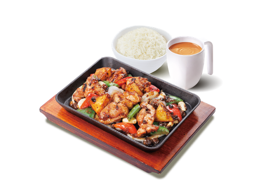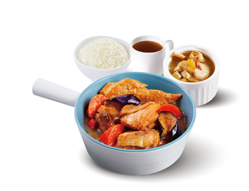 麵醬茄子燜滑雞 + 白飯 + 熱飲