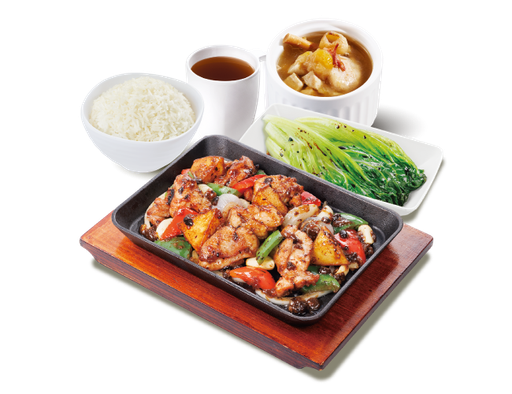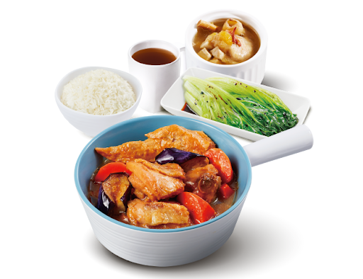 麵醬茄子燜滑雞 + 白飯 + 灼菜 + 是日燉湯 + 中國茶