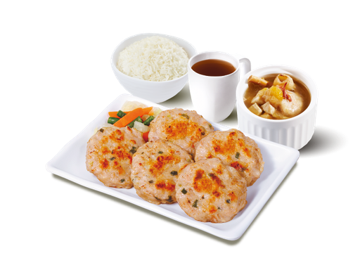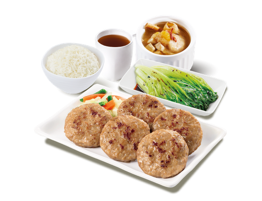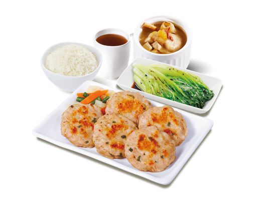 香煎蝦米冬菇肉餅 + 白飯 + 灼菜 + 是日燉湯 + 中國茶