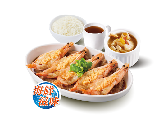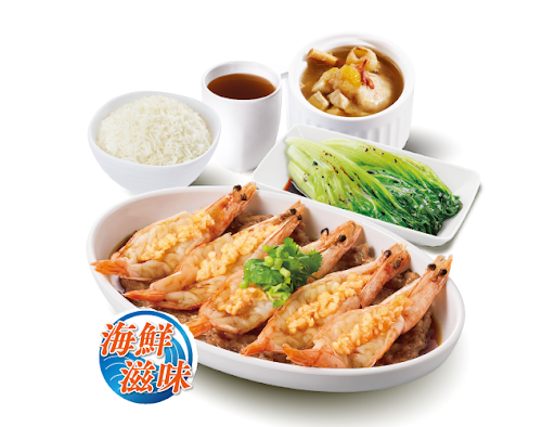 蒜茸大蝦蒸肉餅 + 白飯 + 灼菜 + 是日燉湯 + 中國茶