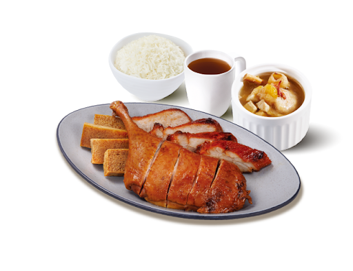 滷水鴨胸拼燒味(可選叉燒/燒鴨/油雞/切雞) + 白飯 + 是日燉湯 + 中國茶