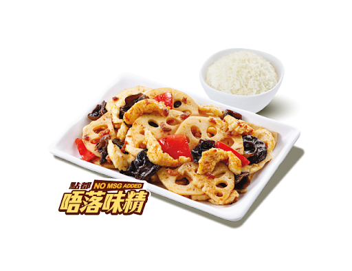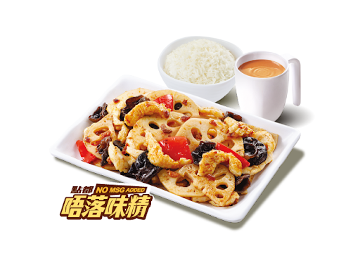 蔥香藕片炒雞柳 + 白飯 + 熱飲