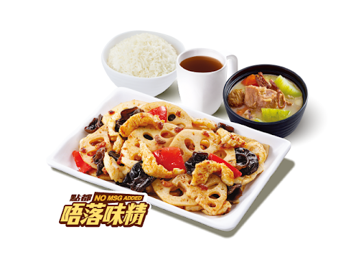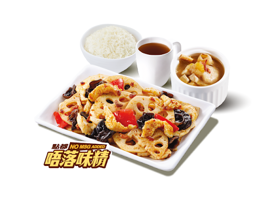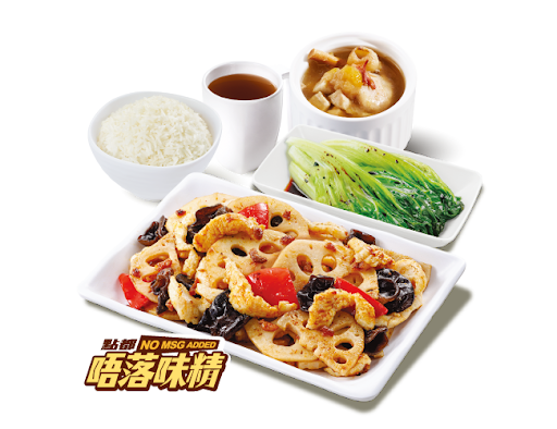 蔥香藕片炒雞柳 + 白飯 + 灼菜 + 是日燉湯 + 中國茶