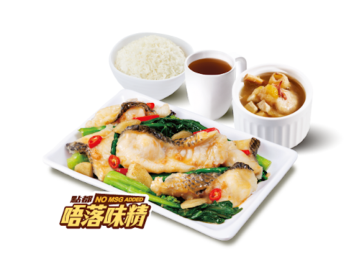 菜心苗榨菜炒生魚片 + 白飯 + 灼菜 + 是日燉湯 + 中國茶