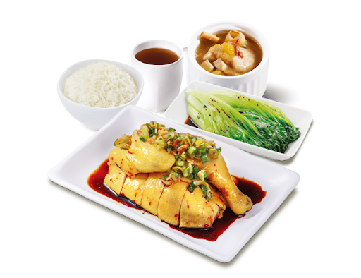 蔥油雞(半隻) + 白飯 + 灼菜 + 是日燉湯 + 中國茶