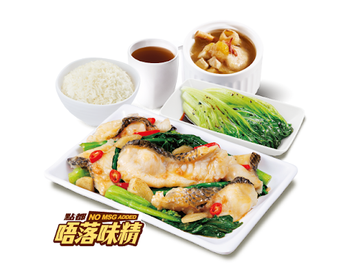 滑蛋粟米魚塊 + 白飯 + 灼菜 + 是日燉湯 + 中國茶