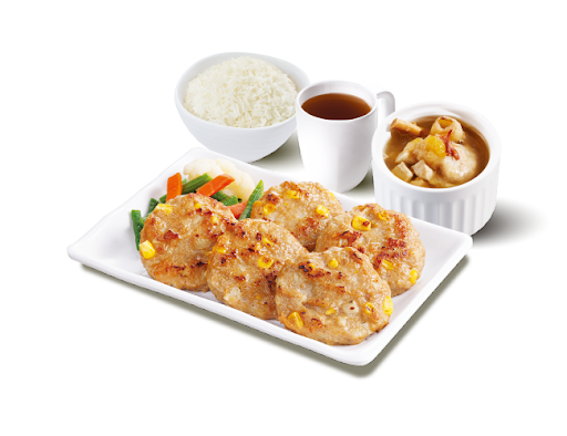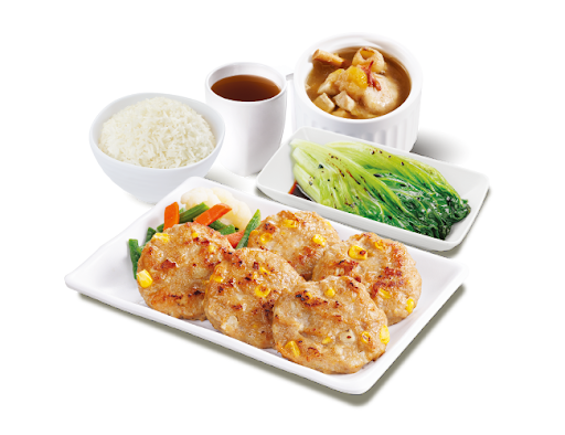 香煎粟米馬蹄肉餅 + 白飯 + 熱飲