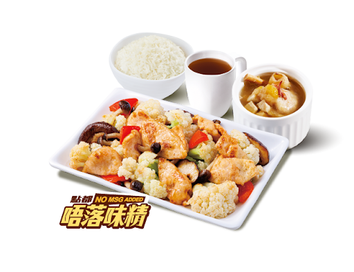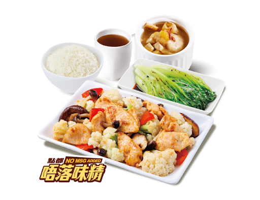 美極野菌椰菜花炒滑肉 + 白飯 + 灼菜 + 是日燉湯 + 中國茶