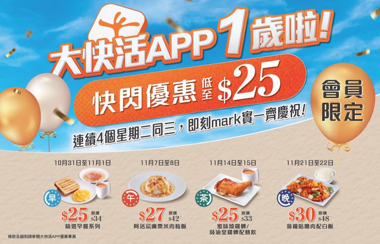 大快活App一歲喇!多謝大家過去一年嘅支持。阿活會連續4星期,每星期二同三推出快閃優惠低至$25 一餐,一齊慶祝,一齊食盡早午茶晚!