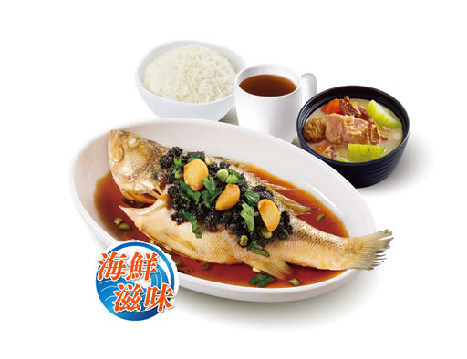Steamed Pomfret in Black Bean Sauce + Rice + Seasonal Soup + Chinese Tea