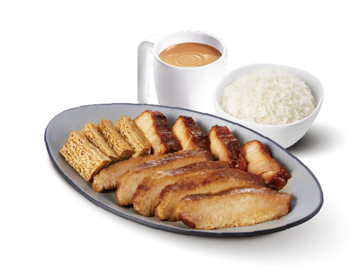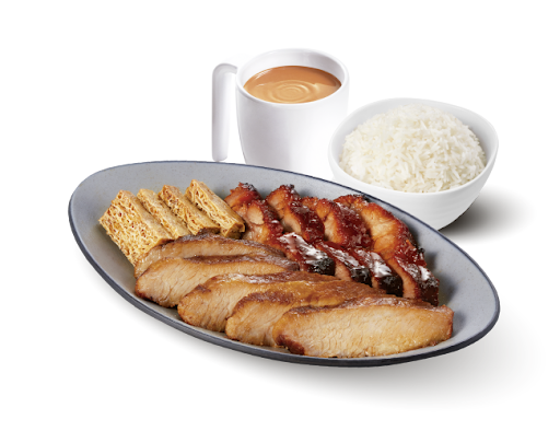 Crispy Roasted Pork Belly and One Choice of Roasted Meat with Rice + Hot Drink