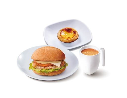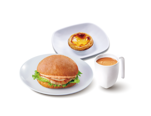 Grilled Bun with Pan-fried Chicken Fillet and Cheese + Portuguese Egg Tart(Mini) + Hot Drink