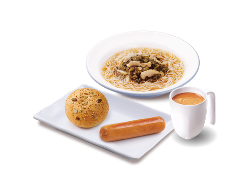 Shredded Pork and Preserved Vegetables with Rice Vermicelli in Soup(Mini) + Pumpkin Seeds and Soya Milk Soft Bun + Jumbo Sausage + Hot Drink