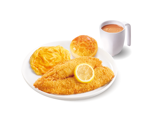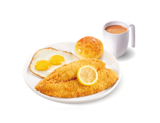 即炸原條脆魚柳 + 阿活脆邊煎雙蛋 + 迷你菠蘿包 + 熱飲