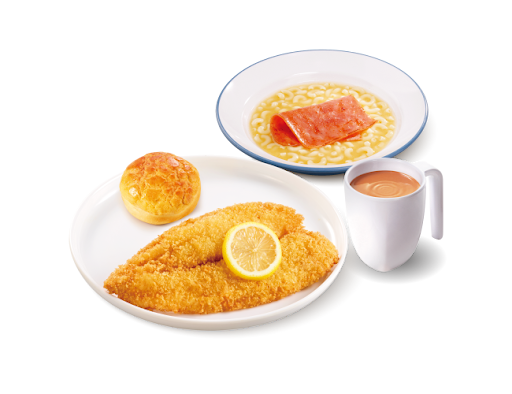 即炸原條脆魚柳 + 火腿湯通粉 + 迷你菠蘿包 + 熱飲