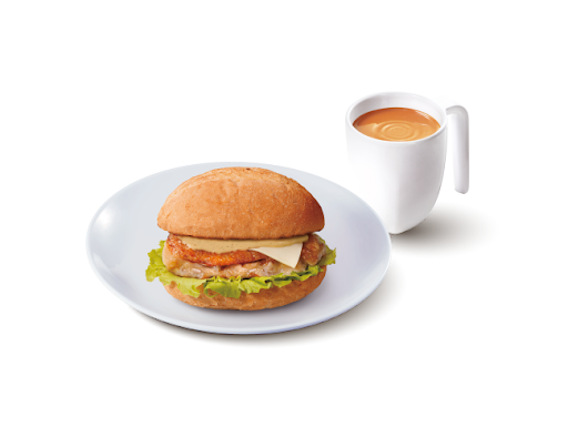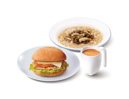 香煎雞扒芝士脆豬包 + 迷你雪菜肉絲湯米粉 + 熱飲