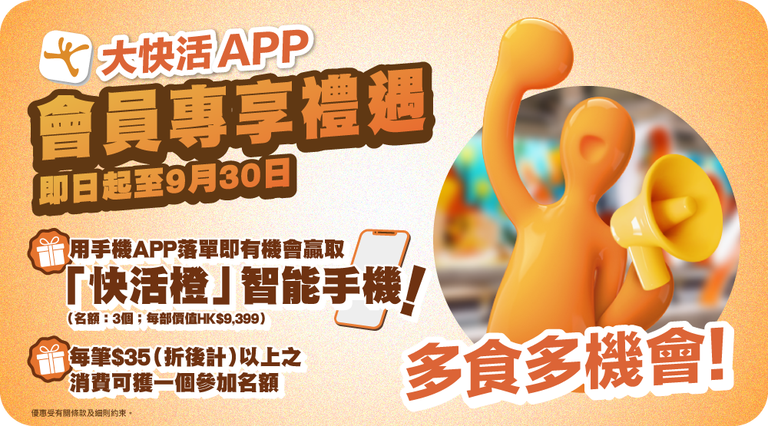 即日起至2025年9月30日,只要消費滿$35(折後計)即自動參加,每筆合資格會員交易可獲一個參加名額。根據交易嘅時序,進行第50,000、100,000及150,000單合資格交易嘅3位會員只需要回答到指定問題,即可免費贏取「快活橙🍊」智能手機一部!消費次數越多,機會越大!📱✨